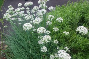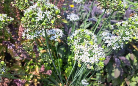 - Common chives have pretty pink flowers in the spring and white flowers in the fall. The pollinators love the flowers too!